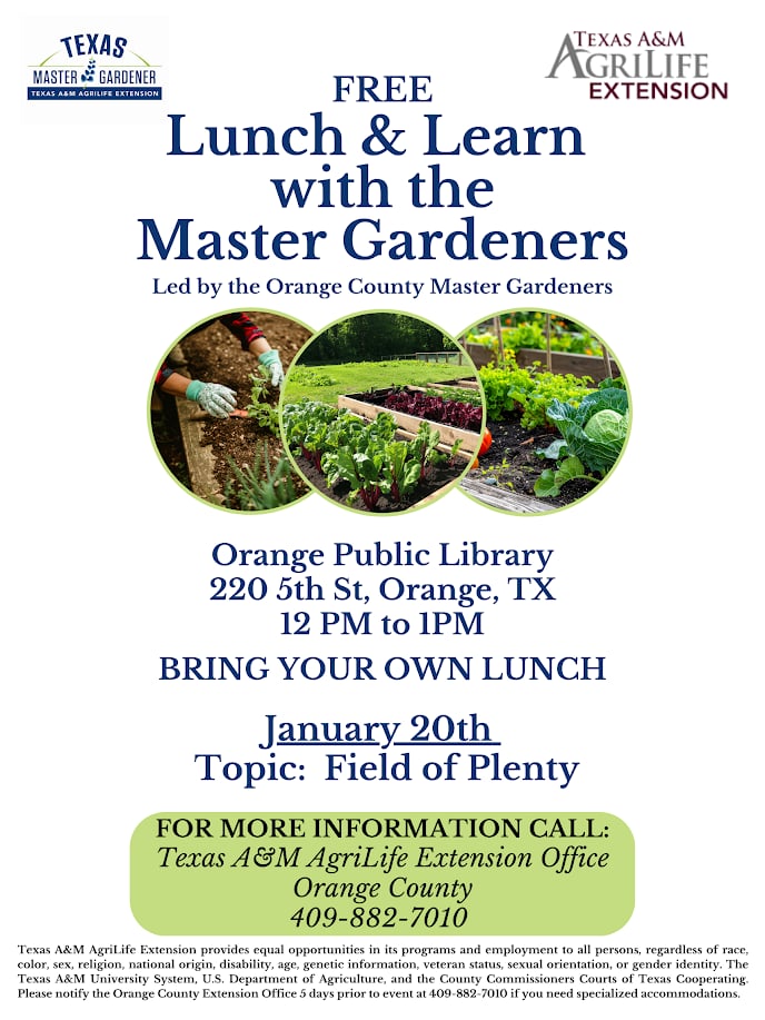 The Orange County Master Gardeners are partnered with Texas A&M AgriLife Extension - Orange County and the Texas Master Gardener Program.