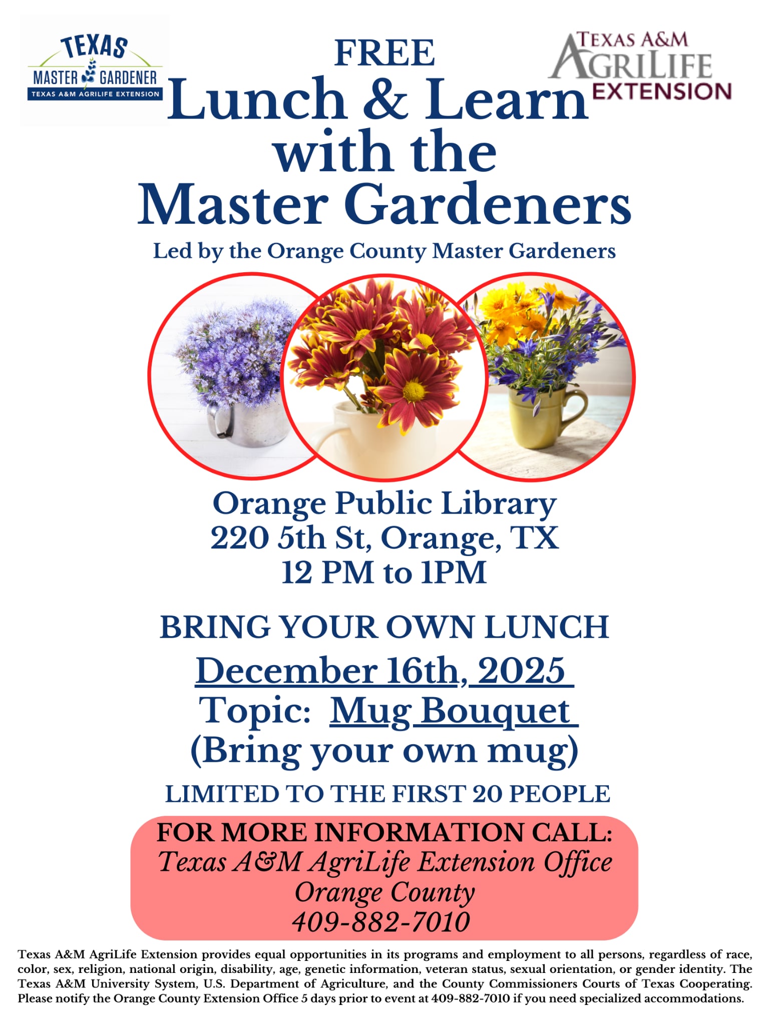 The Orange County Master Gardeners are partnered with Texas A&M AgriLife Extension - Orange County and the Texas Master Gardener Program.